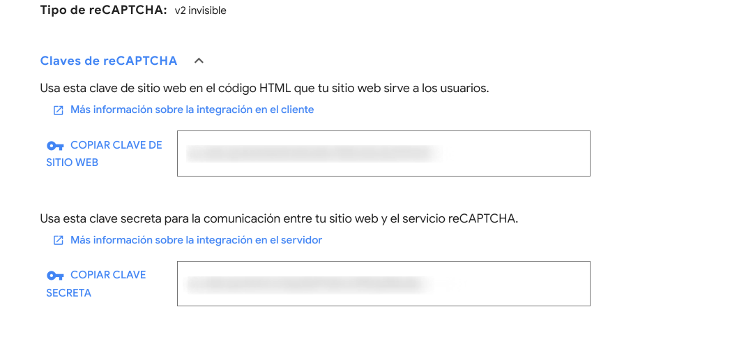 Una vez creado el sitio nos dará dos claves, una llamada CLAVE DE SITIO WEB, que será nuestra clave pública y que será con la cual se haga la petición, y la CLAVE SECRETA, que hara la comunicación entre nuestro sitio web y el servicio reCAPTCHA.
