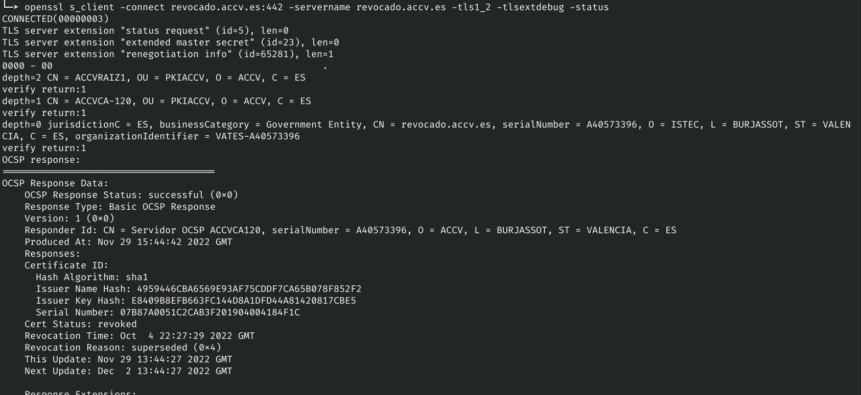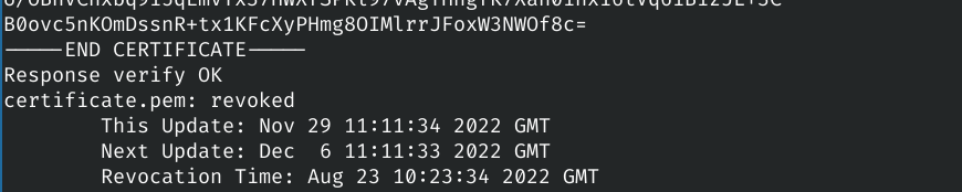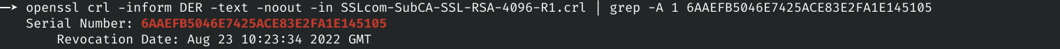 openssl crl -inform DER -text -noout -in SSLcom-SubCA-SSL-RSA-4096-R1.crl At this point we can verify if the serial number of the certificate is revoked or not. In this case, we can see that it is revoked from August 23.