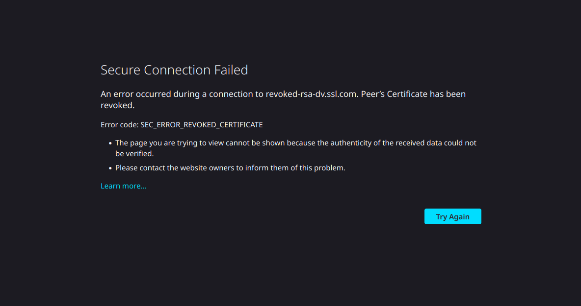 If we open the following URL (https://revoked-rsa-dv.ssl.com/) which has a revoked certificate in Firefox, we received the following error message.